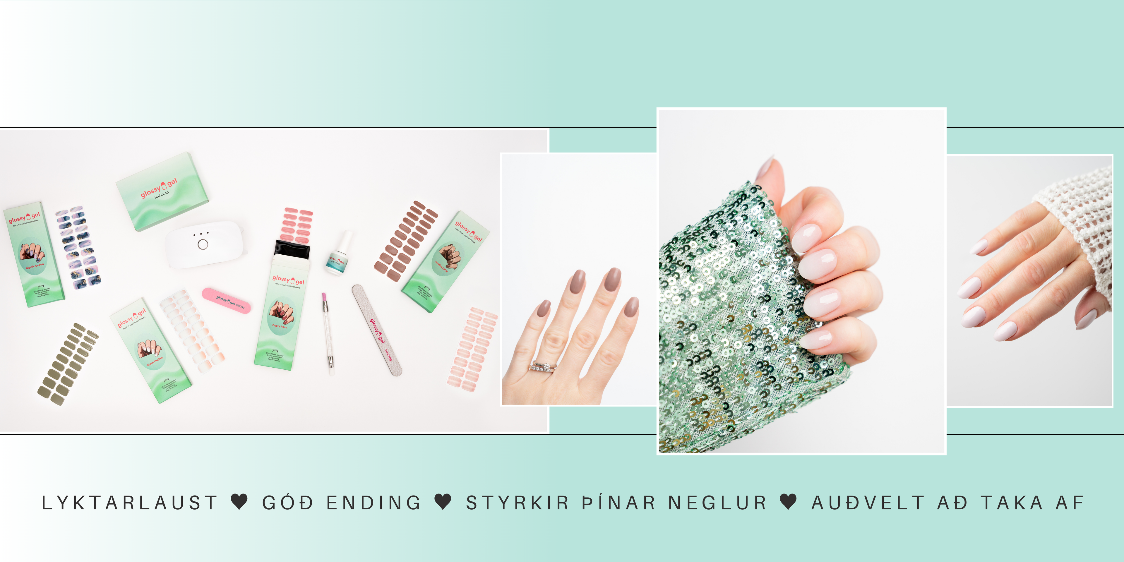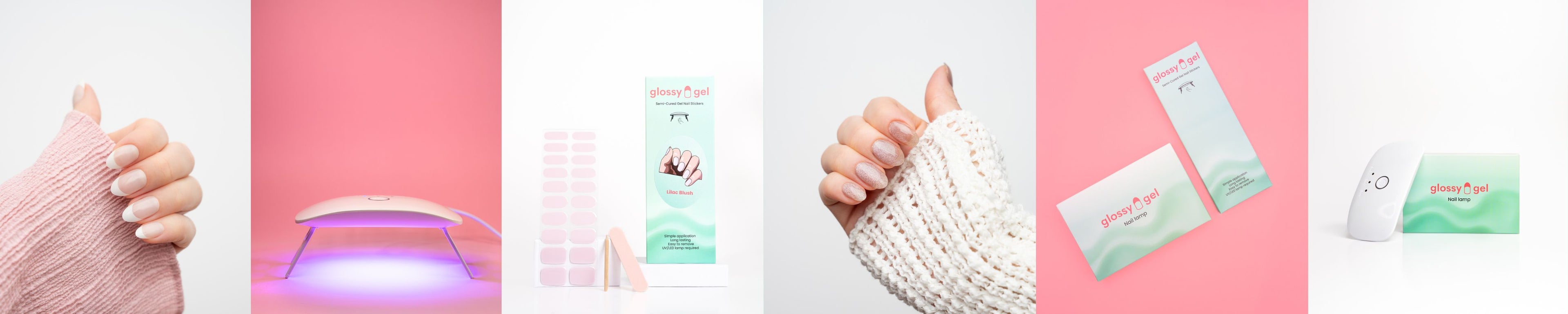 Glossy Gel eru einfaldir, hálfhertir gel-límmiðar sem gefa þér fallegar og endingargóðar gelneglur þegar þér hentar. Glossy Gel límmiðarnir eru auðveldir í notkun, setjast fullkomlega á þínar neglur og harðna undir naglalampa til að tryggja að þeir endist á í allt að 2 vikur. Glossy Gel límmiðarnir koma hertir að hluta til sem gerir þá sveigjanlega, teygjanlega og mjög auðvelda í notkun.