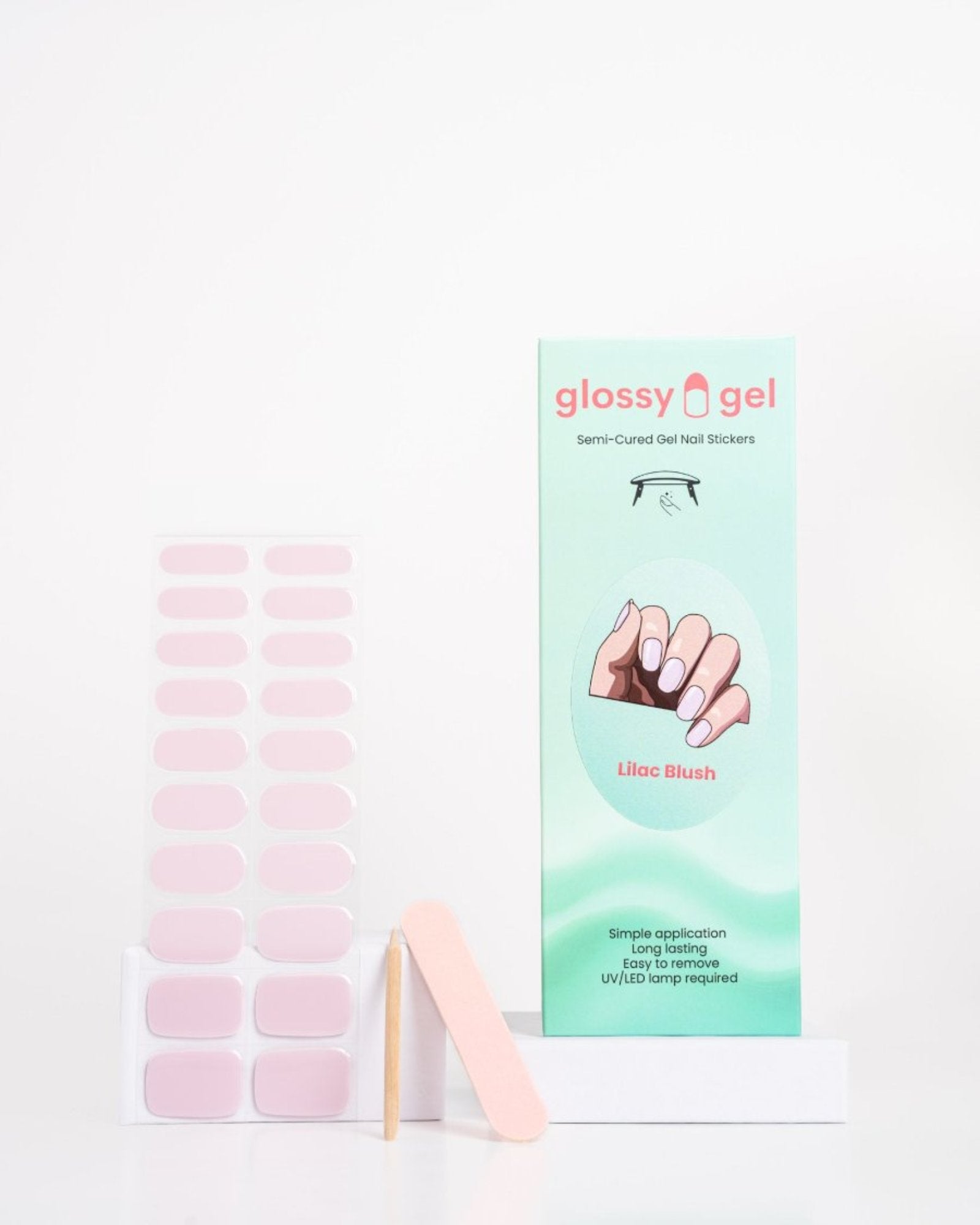 Glossy Gel eru einfaldir, hálfhertir gel-límmiðar sem gefa þér fallegar og endingargóðar neglur þegar þér hentar. Glossy Gel límmiðarnir eru auðveldir í notkun, setjast fullkomlega á þínar neglur og harðna undir nagla lampa til að tryggja að þeir endist á í allt að 2 vikur.