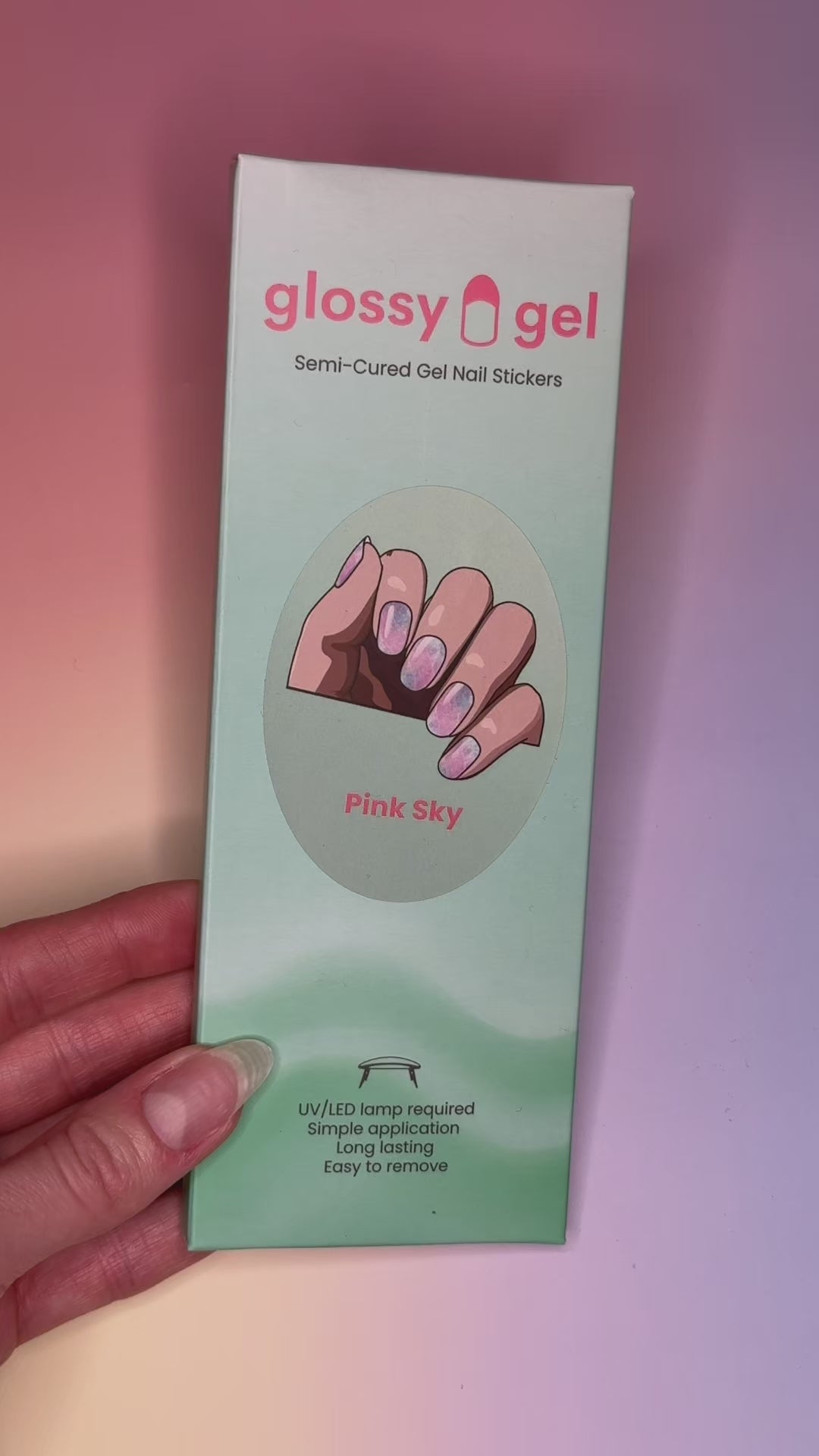 Glossy Gel eru einfaldir, hálfhertir gel-límmiðar sem gefa þér fallegar og endingargóðar neglur þegar þér hentar. Glossy Gel límmiðarnir eru auðveldir í notkun, setjast fullkomlega á þínar neglur og harðna undir nagla lampa til að tryggja að þeir endist á í allt að 2 vikur.